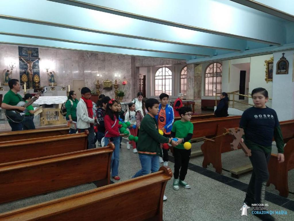 Vi cómo todos los niños participábamos con entusiasmo y nerviosos, llevando pancartas de colores y el rosario de unicel que representaban los cinco continentes.